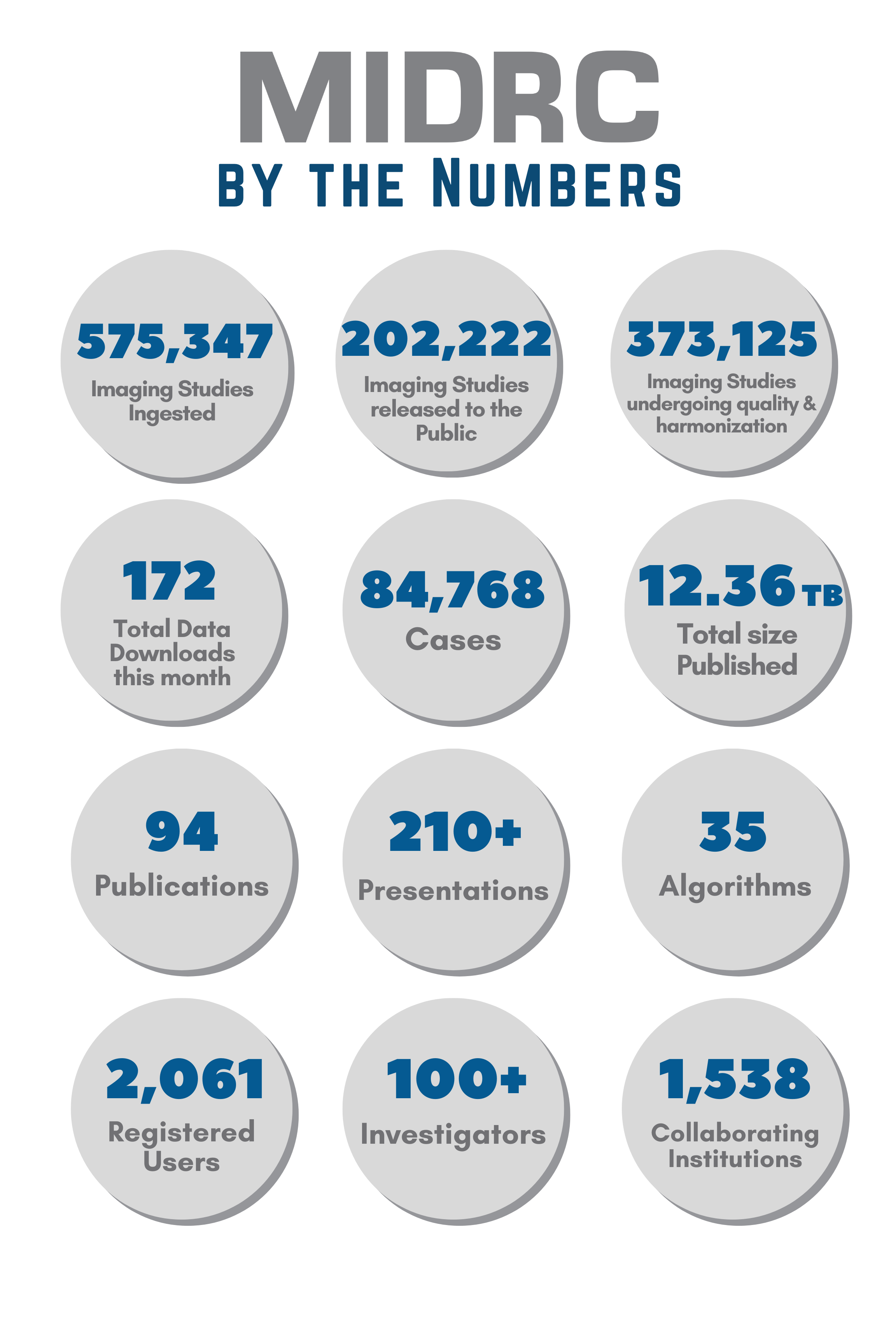 MIDRC is a multi-institutional collaborative initiative driven by the medical imaging community that was initiated in late summer 2020. MIDRC, funded by the National Institute of Biomedical Imaging and Bioengineering (NIBIB) and hosted at the University of Chicago, is co-led by the American College of Radiology® (ACR®), the Radiological Society of North America (RSNA), and the American Association of Physicists in Medicine (AAPM). The aim of MIDRC is to foster machine learning innovation through data sharing for rapid and flexible collection, analysis, and dissemination of imaging and associated clinical data by providing researchers with unparalleled resources.