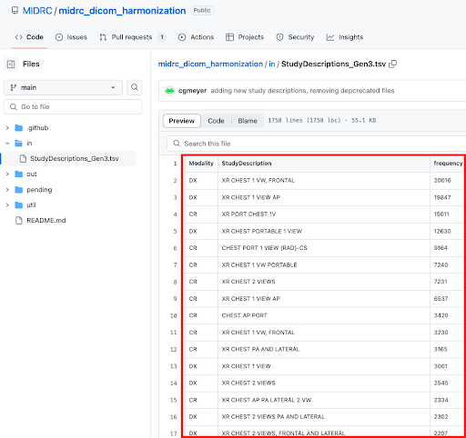 Before harmonization: Raw input for the LOINC harmonization process, which is a list of Modality and Study Description combinations sorted by their frequency of occurrence in MIDRC data.