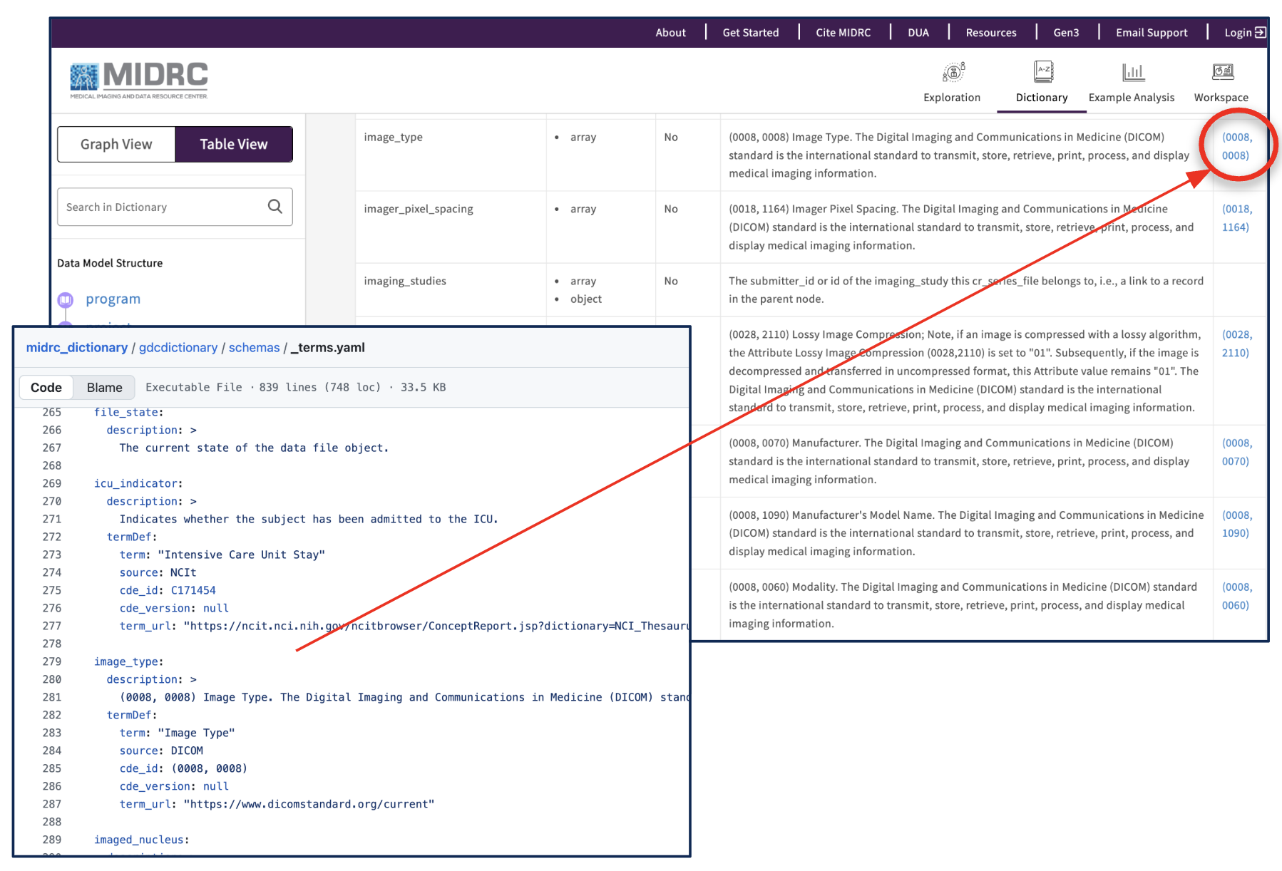 https://github.com/MIDRC/midrc_dictionary/blob/master/gdcdictionary/schemas/_terms.yamlMIDRC has also worked with the National Library of Medicine to request new standard CDEs for properties that lacked suitable existing terms, contributing to broader data standardization efforts.
